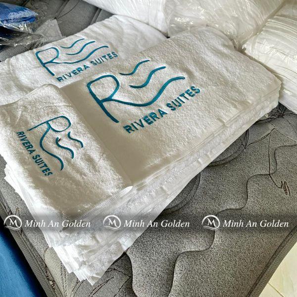 - Khách sạn, resort: Ưu tiên Khăn tắm, khăn mặt Cotton 100% mềm mại, thấm hút tốt, kích thước tiêu chuẩn (70 x 140 cm). Logo thêu tối giản, đặt ở góc khăn để giữ vẻ thanh lịch.